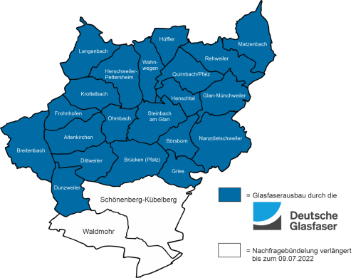 Gute Nachrichten für 21 Gemeinden in der Verbandsgemeinde Oberes Glantal. Nachdem die Nachfragebündelung in den Orten Breitenbach, Glan-Münchweiler, Gries und Altenkirchen erfolgreich verlaufen ist, baut die Deutsche Glasfaser das Glasfasernetz in 21 Orten der Verbandsgemeinde Oberes Glantal aus. Lediglich für Schönenberg-Kübelberg (inkl. Schmittweiler) sowie die Stadt Waldmohr läuft noch die Nachfragebündelung. Diese wurde nun verlängert bis zum 09.07.2022 und somit haben Schönenberg-Kübelberg und Waldmohr weiterhin die Chance die erforderliche Ausbauquote zu