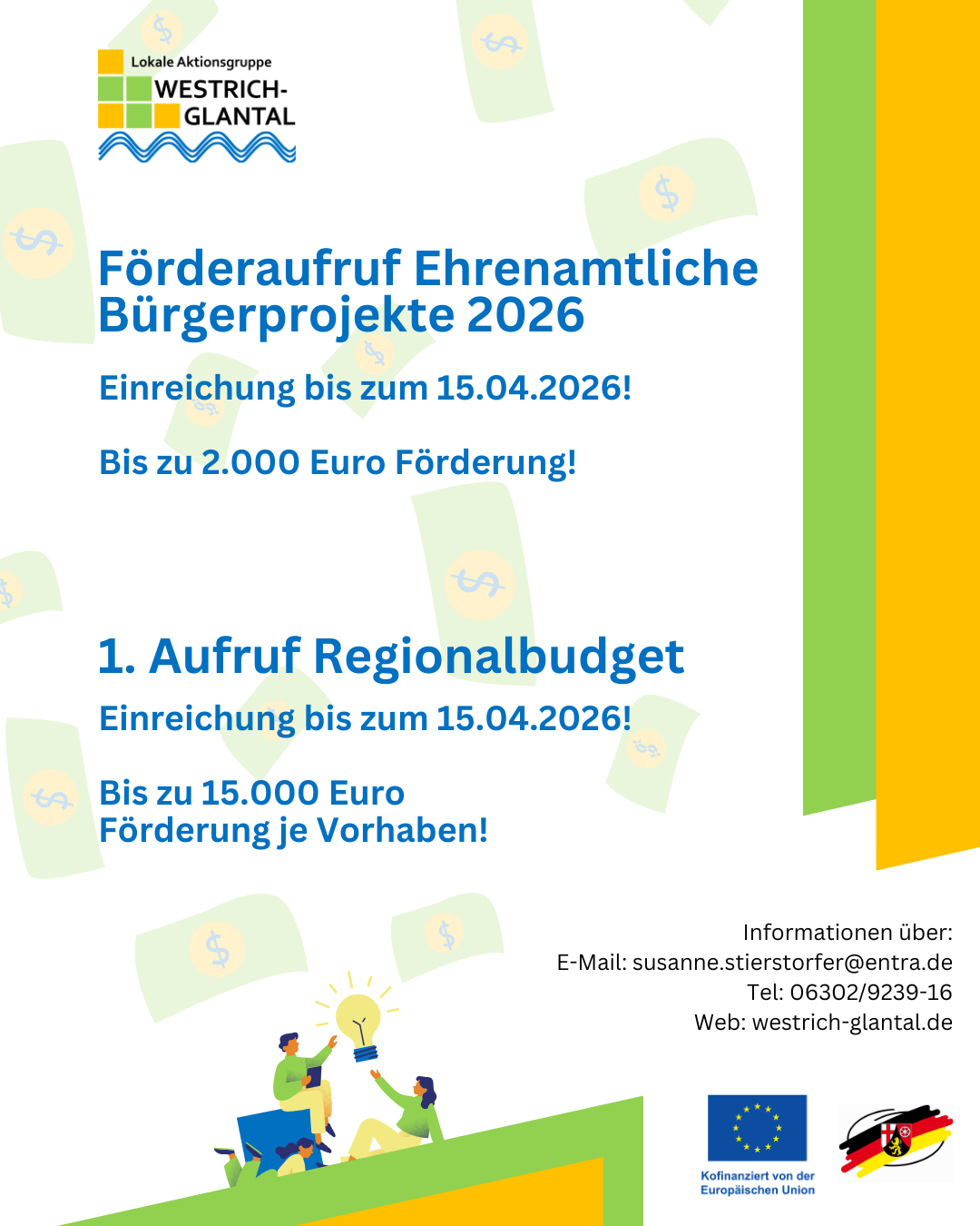 Sie haben eine Idee? Antragsunterlagen beider Fördermöglichkeiten können noch bis zum 15. April 2026 eingereicht werden! Weitere Informationen und Antragsunterlagen finden Sie auf unserer Webseite im Downloadbereich: Downloads - LAG Westrich Glantal