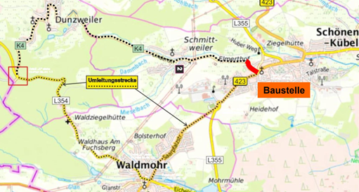 Die Umleitung erfolgt während BA 1 und BA 2 nach Schmittweiler (und in umgekehrter Richtung) über Waldmohr und Dunzweiler